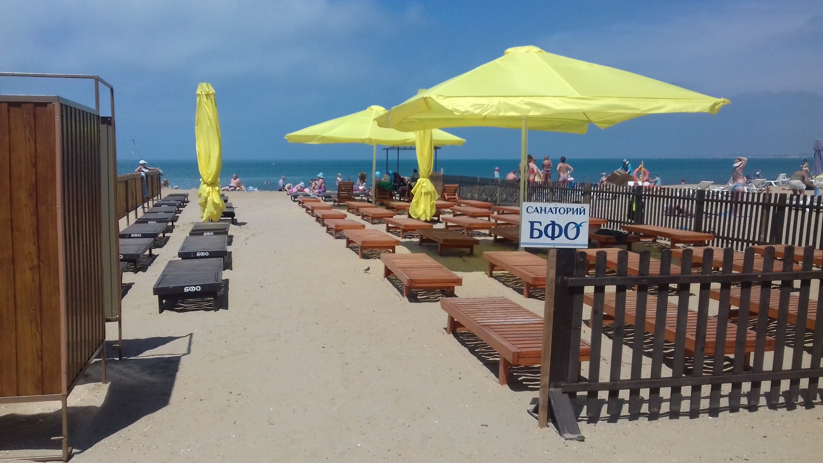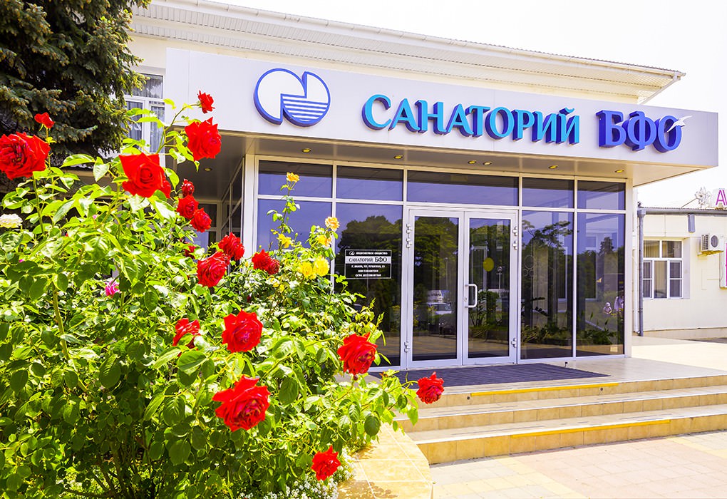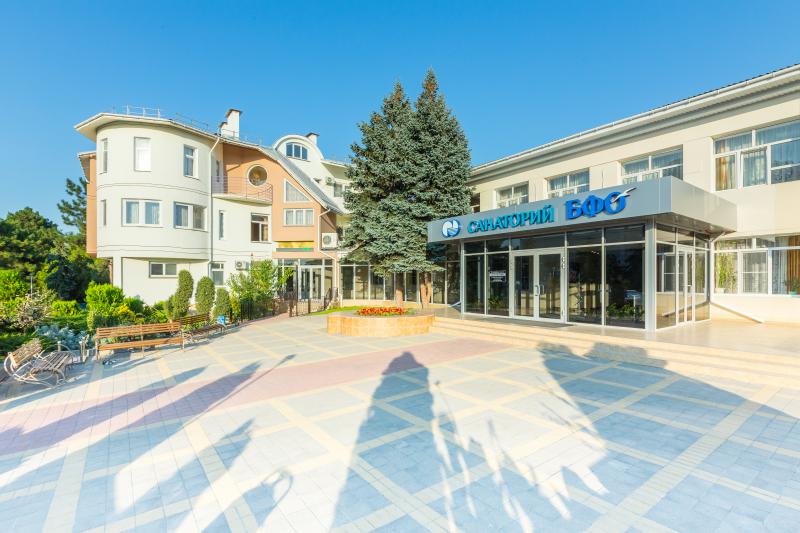Санаторий «БФО» находится в 3 км от центра Анапы. Совсем рядом находится галечный пляж, полностью оборудованный для комфортного отдыха. Если пройти 15 минут, то можно добраться до песчаного пляжа с лежаками, зонтиками, душевыми и другими удобствами. Пропуск туда осуществляется по санаторно-курортным картам.