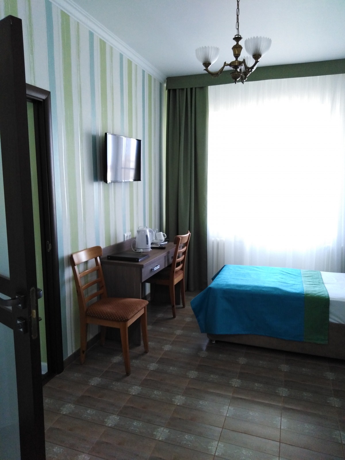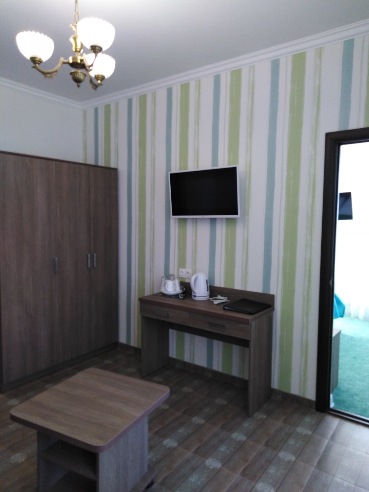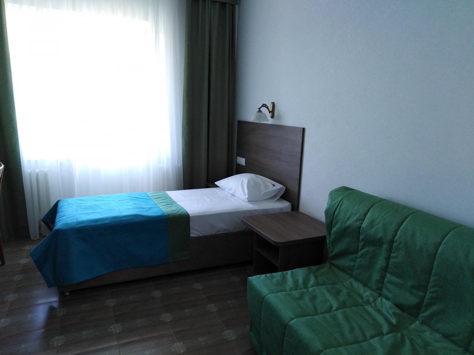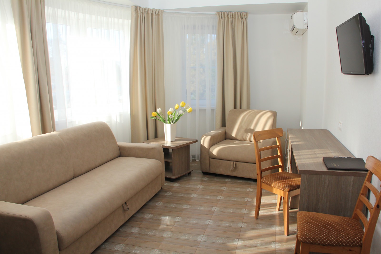 Номер площадью до 27 кв.м включает гостиную и спальню. Для сна предусмотрены диван-кровать и двухспальная кровать.